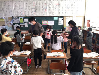 1年生の帰りの会を覗いてみました。3人の児童が前に出て、司会をしていました。今日よくできたことやよい行いを手を上げて発表しています。