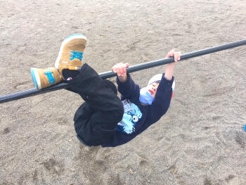 風もなく穏やかな天気です。青空の下でお弁当を食べ、アスレチッ クで思い切り遊びました。この後、メインの砂浜活動です。