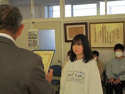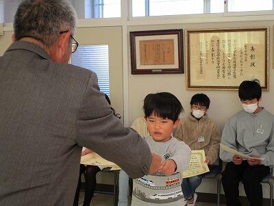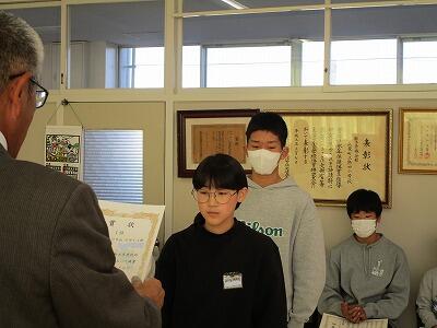 受賞した児童は校長室で賞状を受け取り、その様子をオンラインで各教室に流すという形態で実施しました。