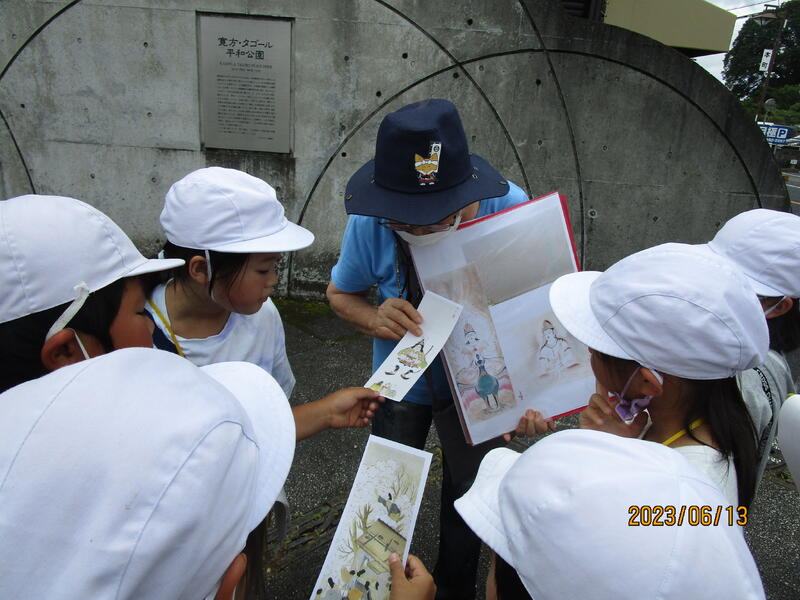 自分たちが住んでいる氏家地区の特色やよさに気付くとともに、興味をもった場所を選び調べていく学習の導入となります。ガイドボランティアの方の協力を得て、氏家地区を散策しました。