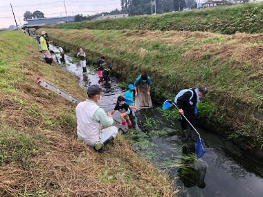 16日午前中、挾間田地域環境保全協議会主催による生き物調査が開催され、十数名の小学生と保護者及び保全会の皆さんが参加し、和気藹々と調査活動を行いました。大きな網やタモを上手に使い、ザリガニやカワムツなどの小魚、タイコウチなどの昆虫を採取しました。学校に戻ってからは専門の先生より生態の様子や由来などの説明を聞き、子ども達も感心しながら耳を傾けていました。