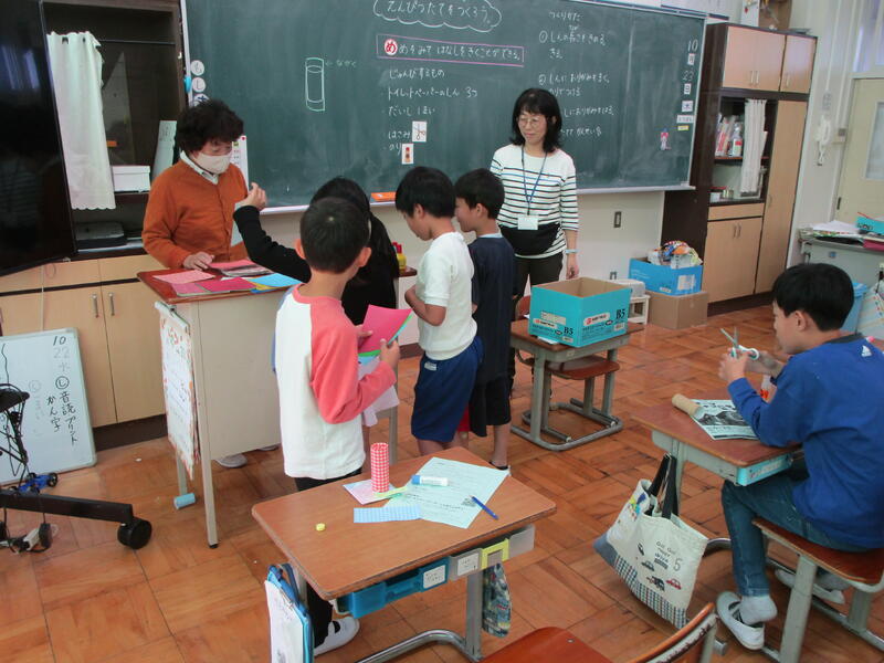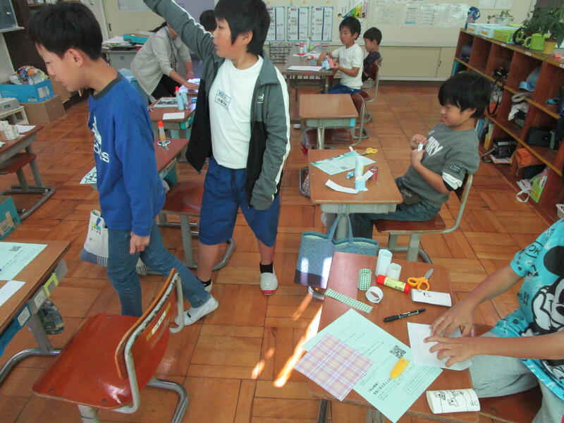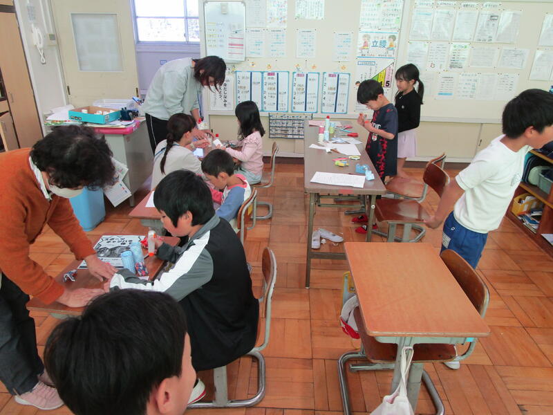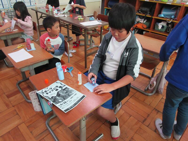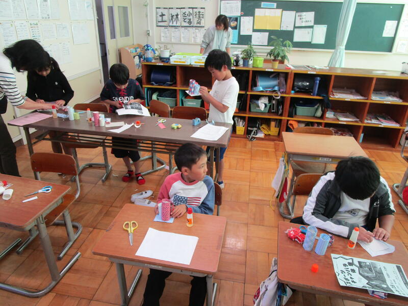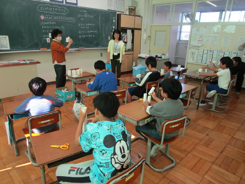 学校運営委員会員、また、元教員業務支援員の砂岡さんの指導の下、トイレットペーパーの芯を使った「えんぴつ立て」を作りました。