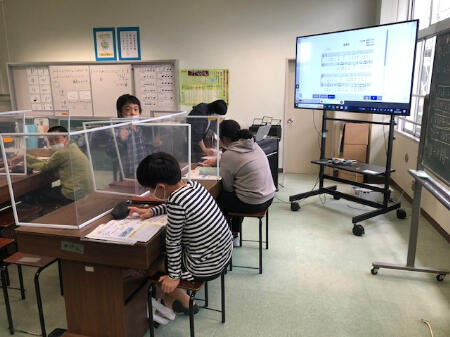 音楽の授業です。「もみじ」を鑑賞し、歌の情景を思い描いています。コロナのため歌唱の授業がまだ完全にはできませんが、工夫しながら実施しています。校舎東側に引っ越し、音楽室に戻ると間隔を広く取れますので、歌声が聞こえるようになると思います。