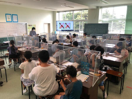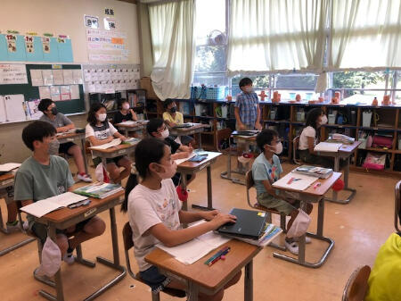 音楽の授業です。現在音楽室は旧パソコン室に設置されていますが、実は図書室と兼用です。図書室の本も引っ越しの際、全てを書架に入れられないので、多くは体育館に保管されています。手狭な音楽室ですが、子ども達は頑張って学習しています。授業ではリコーダーの練習をしていました。周りときちんと音を合わせ、上手に演奏していました。