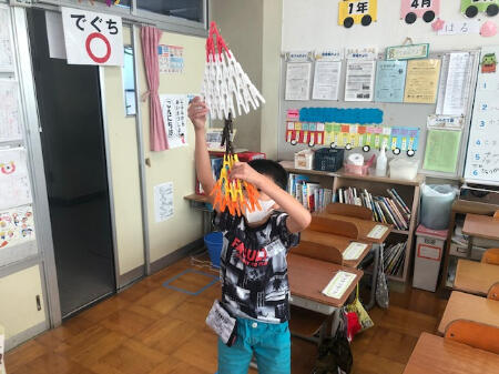 図工の時間です。洗濯ばさみをつないで楽しい形を作る造形遊びの題材です。前回に引き続き、つなぎ方を工夫したり配色を考えたりしながら、思い思いの作品をつくります。友だちと協力してかなり大きな作品をつくってる子たちもいました。