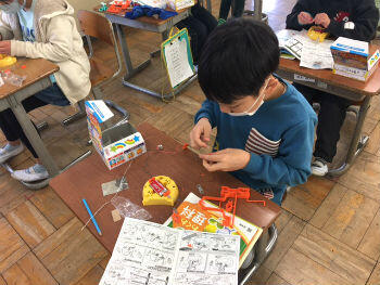 理科の授業で電気の学習をしています。教材キットを使い、電球スタンドの製作です。子ども達は説明図を見ながら必死に作っていました。