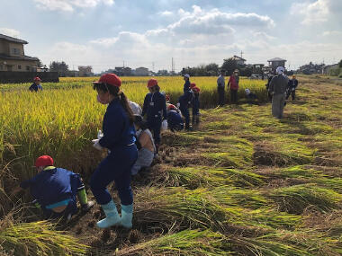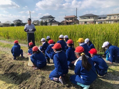 5年生が総合的な学習の時間の一環として稲刈りを実施しました。とてもよい秋晴れの中、汗を流しながら一生懸命に刈ることができました。刈った稲はすぐさまコンバインで脱穀し、作業が終わった後は全員が笑顔になりました。