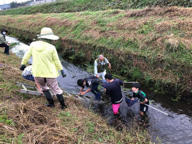 16日午前中、挾間田地域環境保全協議会主催による生き物調査が開催され、十数名の小学生と保護者及び保全会の皆さんが参加し、和気藹々と調査活動を行いました。大きな網やタモを上手に使い、ザリガニやカワムツなどの小魚、タイコウチなどの昆虫を採取しました。学校に戻ってからは専門の先生より生態の様子や由来などの説明を聞き、子ども達も感心しながら耳を傾けていました。