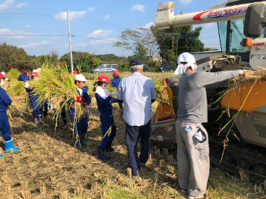 5年生が総合的な学習の時間の一環として稲刈りを実施しました。とてもよい秋晴れの中、汗を流しながら一生懸命に刈ることができました。刈った稲はすぐさまコンバインで脱穀し、作業が終わった後は全員が笑顔になりました。