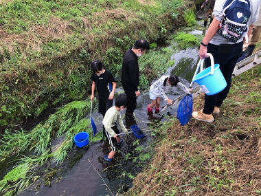 16日午前中、挾間田地域環境保全協議会主催による生き物調査が開催され、十数名の小学生と保護者及び保全会の皆さんが参加し、和気藹々と調査活動を行いました。大きな網やタモを上手に使い、ザリガニやカワムツなどの小魚、タイコウチなどの昆虫を採取しました。学校に戻ってからは専門の先生より生態の様子や由来などの説明を聞き、子ども達も感心しながら耳を傾けていました。