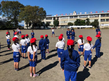 全体練習で初めてラジオ体操を合わせました。なんとなくぎこちなさがあるものの上手にできました。教室で練習していたようです。