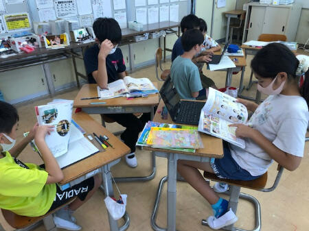 音楽の授業です。現在音楽室は旧パソコン室に設置されていますが、実は図書室と兼用です。図書室の本も引っ越しの際、全てを書架に入れられないので、多くは体育館に保管されています。手狭な音楽室ですが、子ども達は頑張って学習しています。授業ではリコーダーの練習をしていました。周りときちんと音を合わせ、上手に演奏していました。
