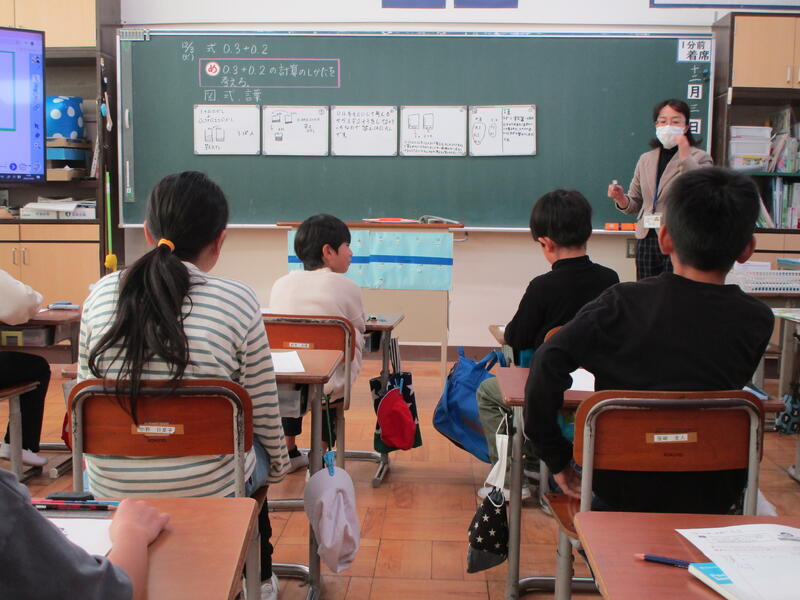 3年生の算数の授業です。「小数の表し方としくみに着目し、0.3+0.2の計算のしかたを考え、説明する」ことがめあてです。