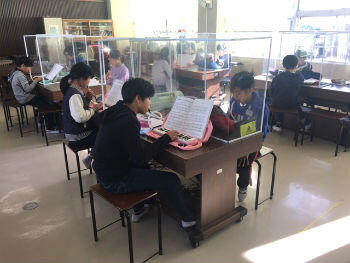 音楽の授業の様子です。音楽室はオルガンが机代わりになっていますが、6つが対面して連結しており、今までは密を避けるため使用を控えてきました。現在は塩ビ版によるパテ-ションで区切り、さらに座席を分散して使用しています。