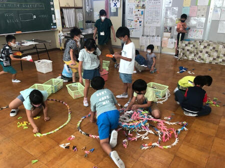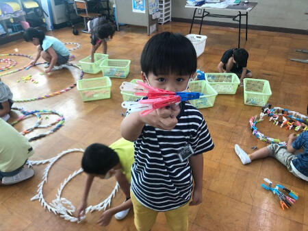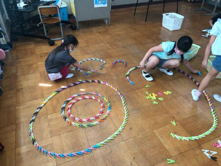 図工の時間です。洗濯ばさみをつないで楽しい形を作る造形遊びの題材です。前回に引き続き、つなぎ方を工夫したり配色を考えたりしながら、思い思いの作品をつくります。友だちと協力してかなり大きな作品をつくってる子たちもいました。