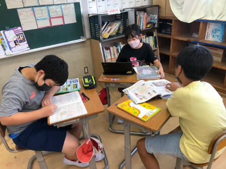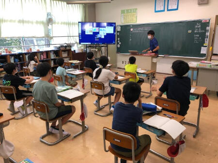 音楽の授業です。現在音楽室は旧パソコン室に設置されていますが、実は図書室と兼用です。図書室の本も引っ越しの際、全てを書架に入れられないので、多くは体育館に保管されています。手狭な音楽室ですが、子ども達は頑張って学習しています。授業ではリコーダーの練習をしていました。周りときちんと音を合わせ、上手に演奏していました。