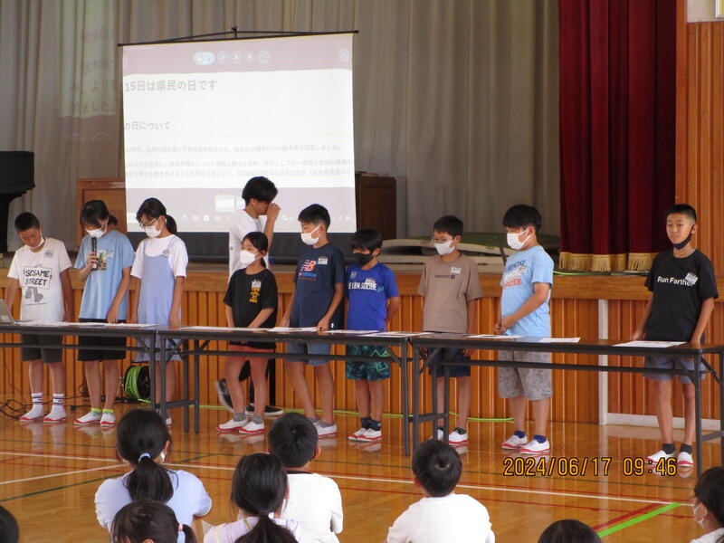 最後に校長先生から、①「栃木県民の日」の意味、由来、年数(年齢)②「栃木県」「熟田小学校」「東京都」「さくら市」の年数(年齢)について③栃木県のことを考えて、栃木県の自慢をほしい との話がありました。