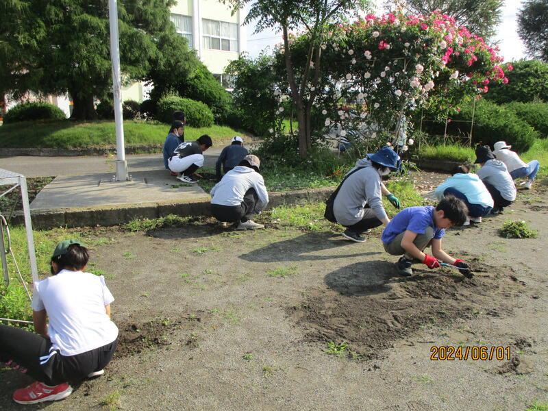 1校時は、6年生による花壇の黒マルチ張り、3~5年生による校庭の除草です。