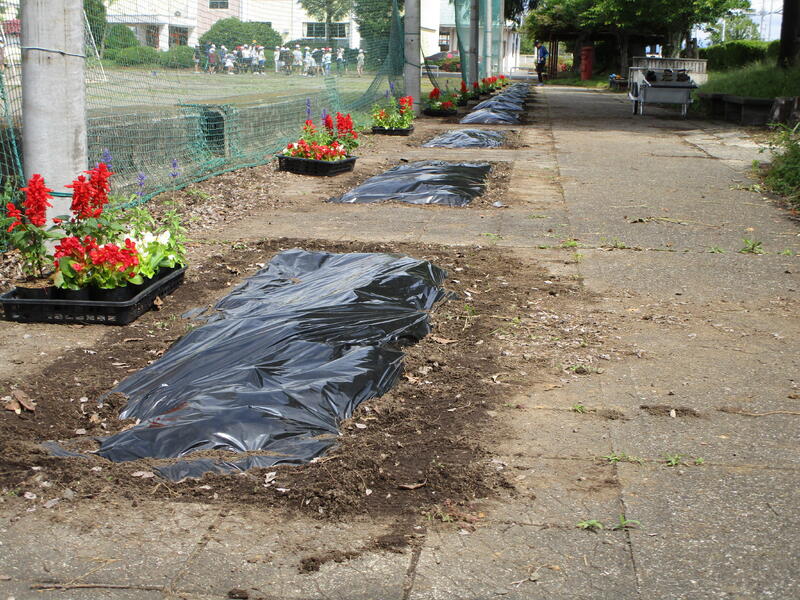 気になるマルチ張りは……? こんなにきれいに張れました。花植えの準備も万全です。