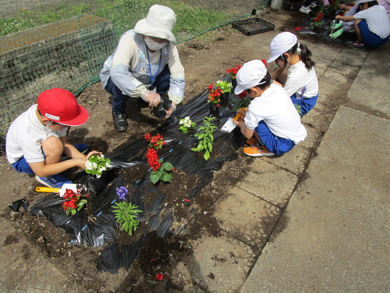 3,4,5年生が除草,6年生が黒マルチ張り、1,2年生が花植え、先生方、ボランティアの方々が支援。正に熟田小学校コミュニティ(学校と地域社会の共同体)で緑化活動が完了ました。