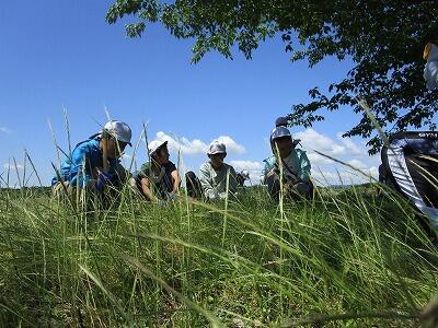 座学の後は、バスでゆうゆうパーク南側の鬼怒川河川敷に移動し、絶滅が危惧されているカワラノギクを守るため、外来植物のシナダレスズメガヤ等の抜き取り作業を行います。