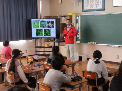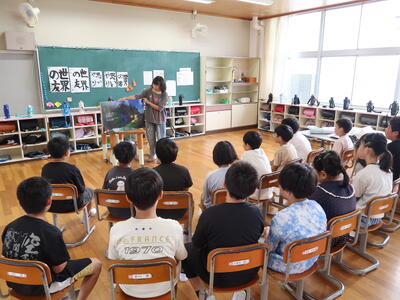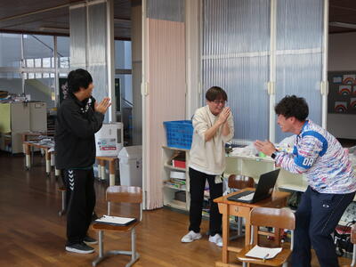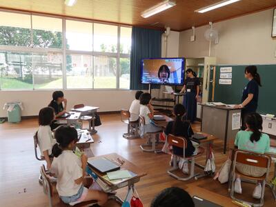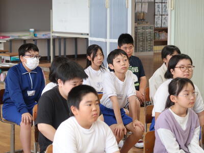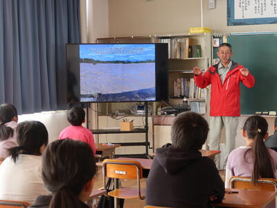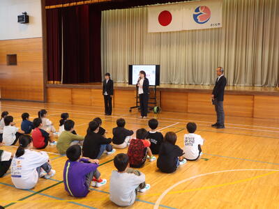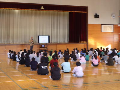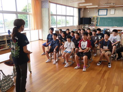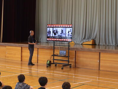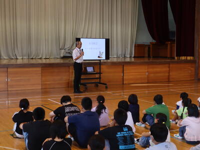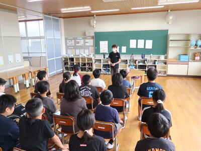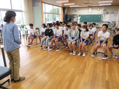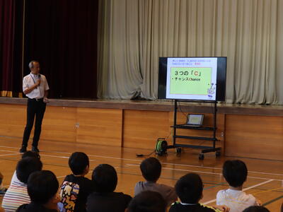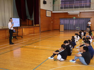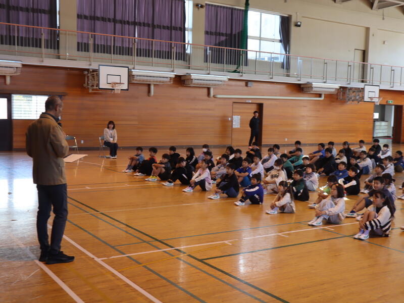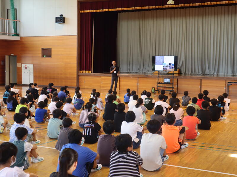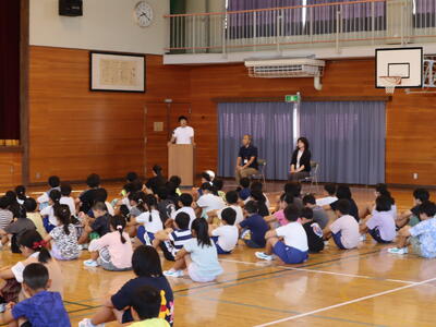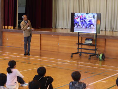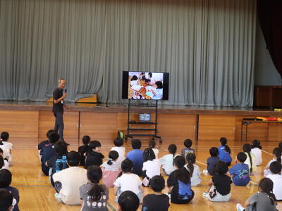 的場さんのご自身の小学校時代の経験や選手時代の思い出などをもとにお話しいただきました。教え子からこんなすばらしいメッセージを子どもたちに伝えてもらい、その様子を見てうれしい気持ちでいっぱいになりました。