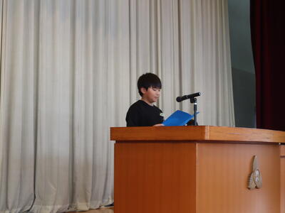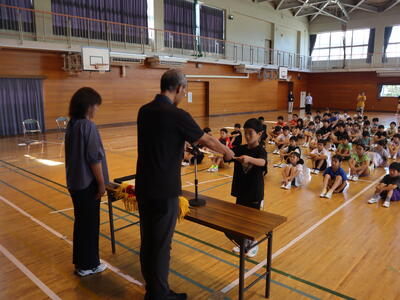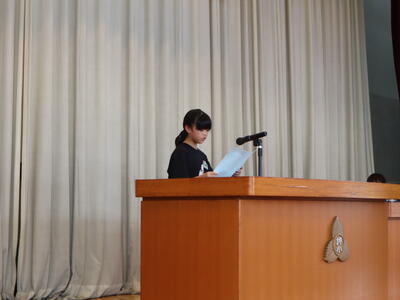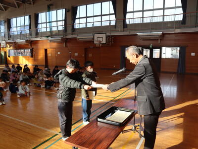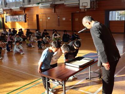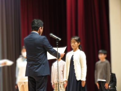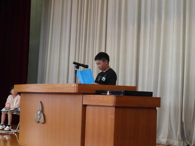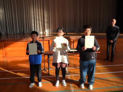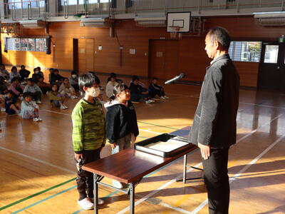 続いて、表彰を行いました。(空手大会(県大会優勝)、野球大会(地区大会準優勝(2大会))返事や所作がとてもすばらしく感心します。