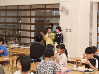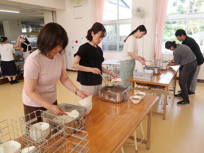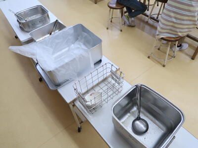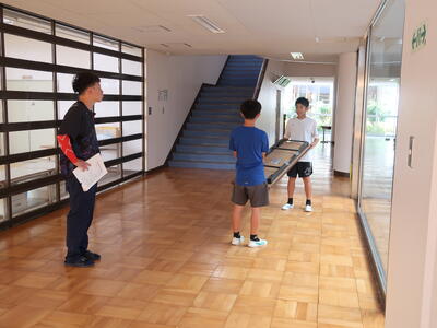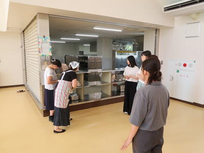 夏休み最終日の26日に、給食の運搬や配膳作業、また、職員による配食や片付けのシミュレーションを行いました。
