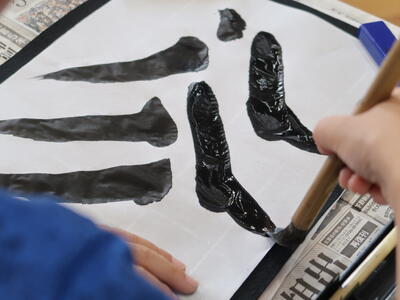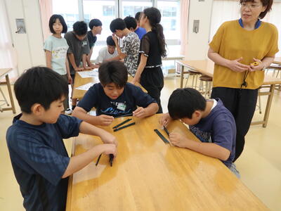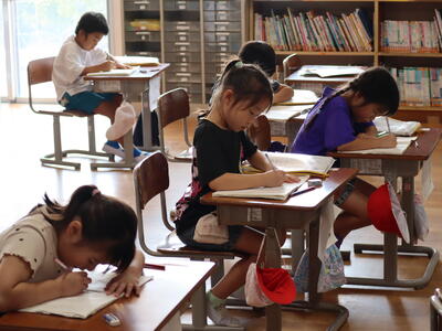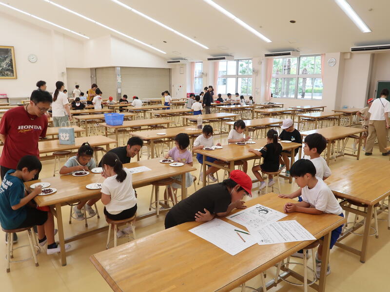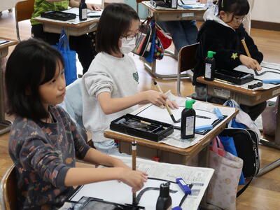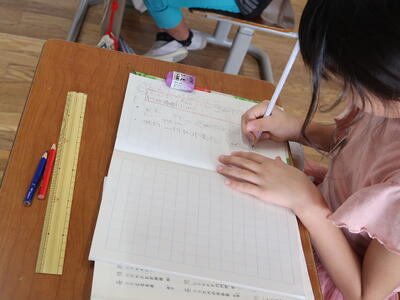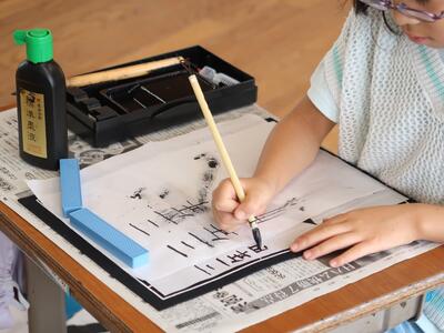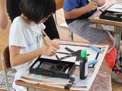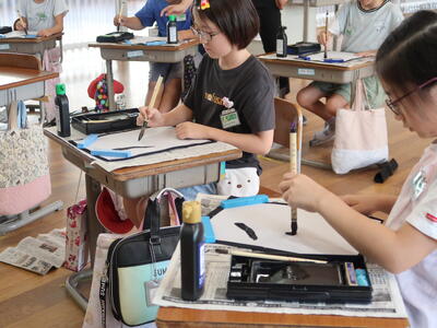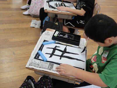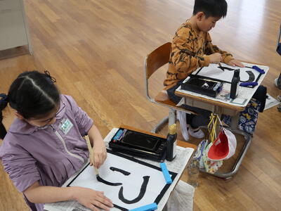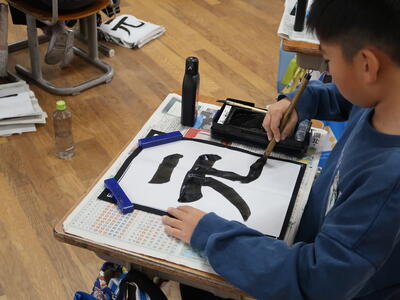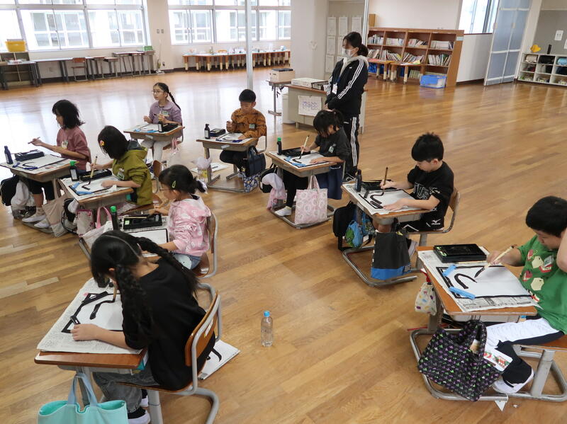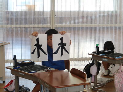 「横画」「縦画」「折れ」に引き続き、今回は「はらい」を学びます。2種類のはらい(左はらい、右はらい)を学び、その2種類のはらいに気を付けながら「木」を書きました。右はらいは、特に難しく、大人でもハードルが高いです。子どもたちは真剣に取り組みました。筆を立てる、穂先は左上向き、そして背筋を伸ばす、など毛筆で大切なことも時折声をかけていただき、意識しながら、真剣に丁寧に書きます。集中力もとてもいいですね。