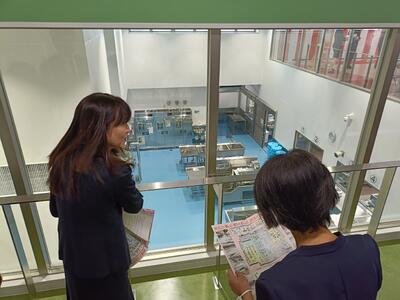開会行事、あいさつ等のあと、施設のお披露目ということで内部見学がありました。立派な施設で4000食の給食が調理され各学校に運ばれます。見学コースを回って眺めているだけで来週からの給食にワクワクでした。