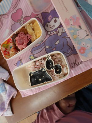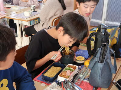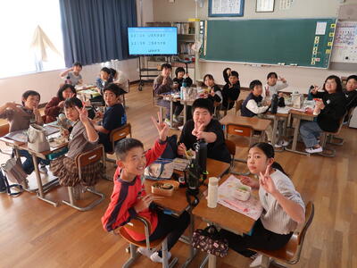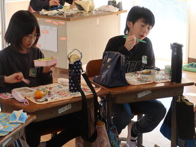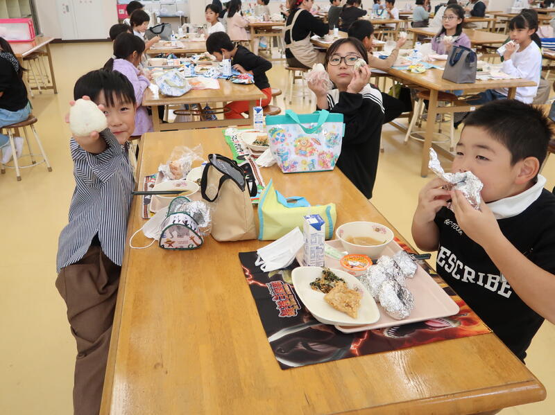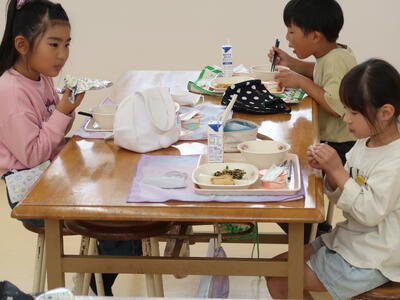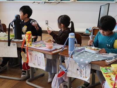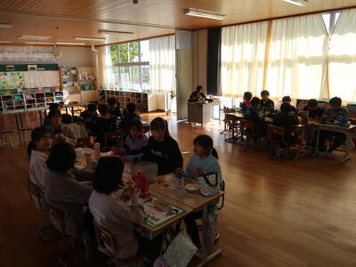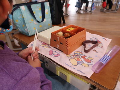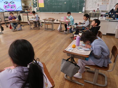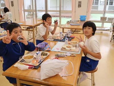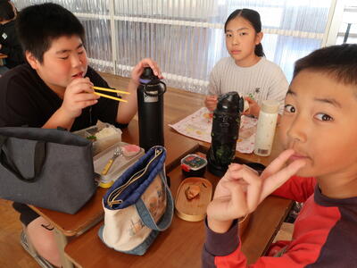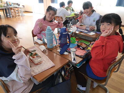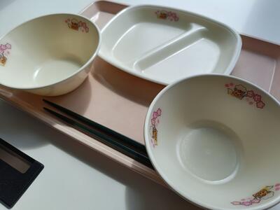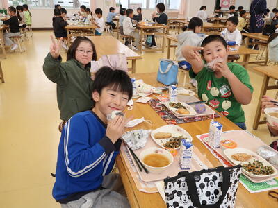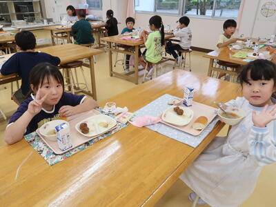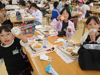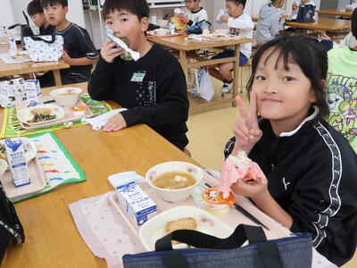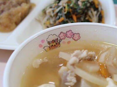 子どもたちも給食が待ち遠しかったのではないかと思います。子どもたちに「ごはんはどう?」と聞いてみると、どの子からも「とてもおいしいです」の声。「(食器やお盆も新しくなったので)いろいろ変わっちゃってびっくりです」という子もいました。「(マスコットキャラクターの「さくらこ」がプリントされた)食器がかわいい」という声も。下の写真は私が検食したときに撮影しました。「さくらこ」がトン汁から顔を出していてかわいいです。トン汁の中を泳いでいるみたいです(^^;)
