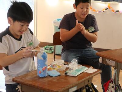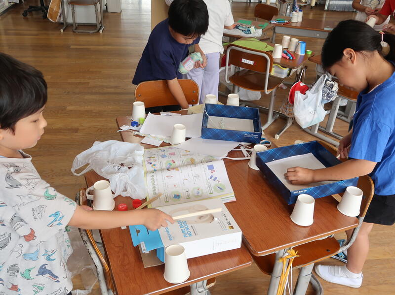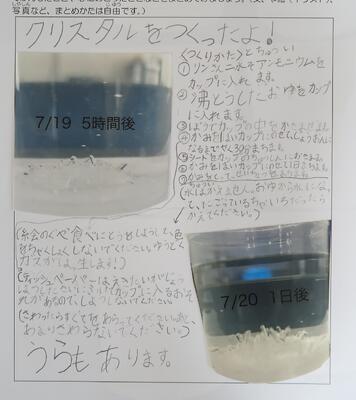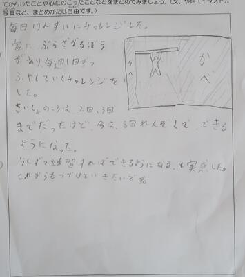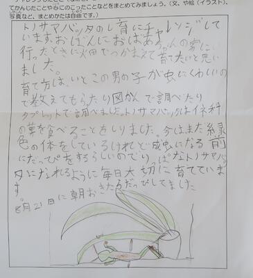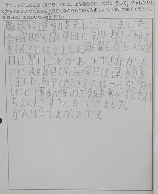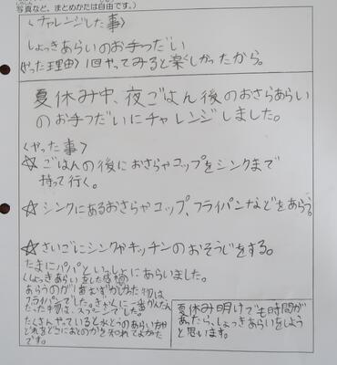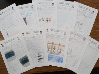 夏休み中、何かにチャレンジをして、成長のチャンスをつかんでほしいと願って出した課題です。興味をもったものや好きなものを作る・調べる、生き物を育てる、体力づくりをする、家族のためにお手伝いをするなど、さまざまなチャレンジがありました。