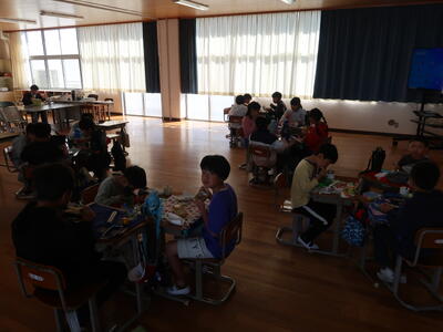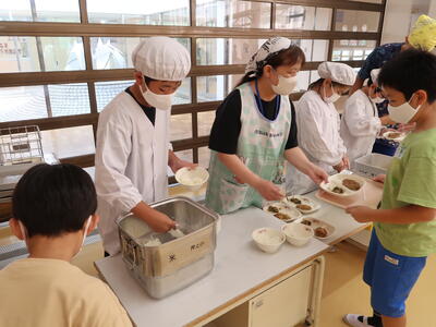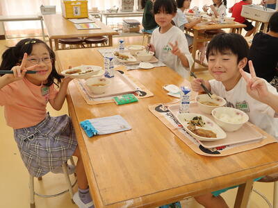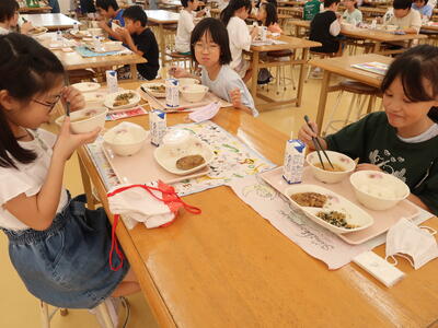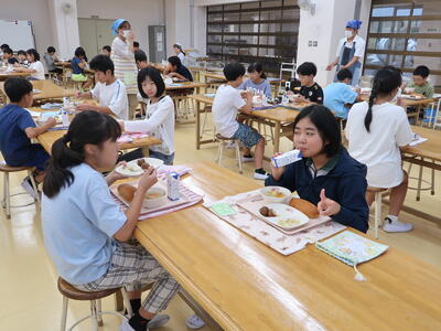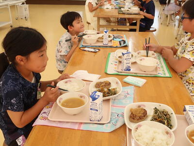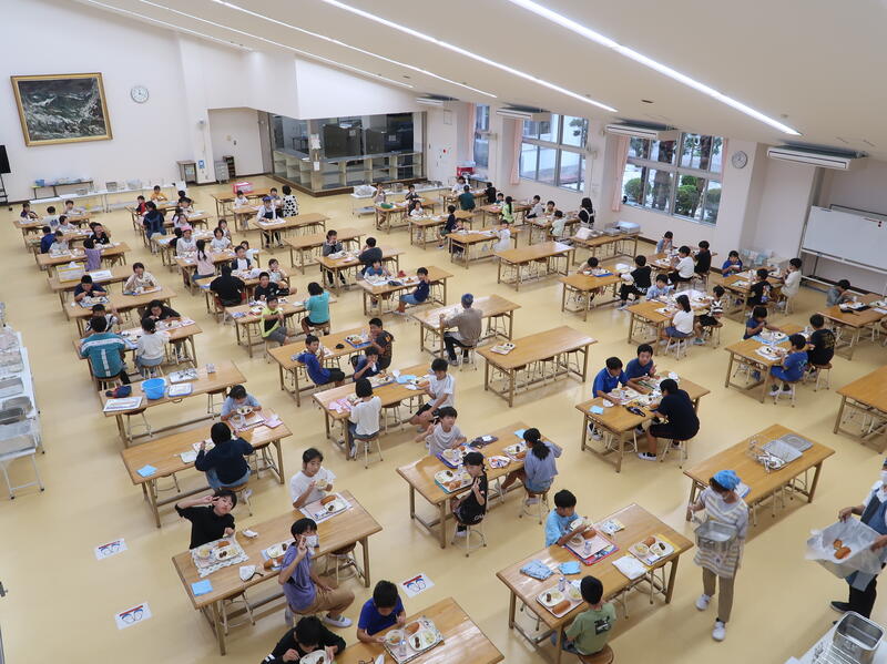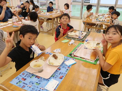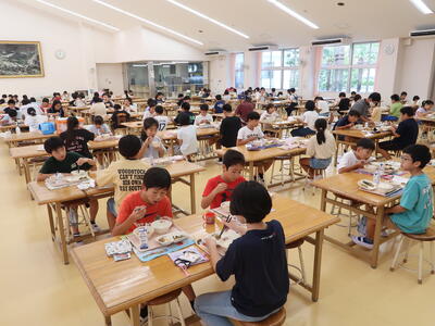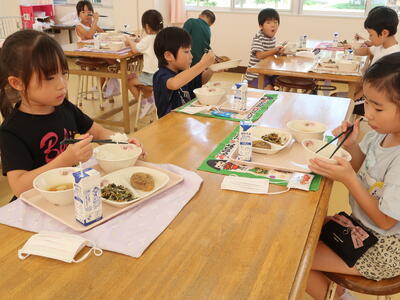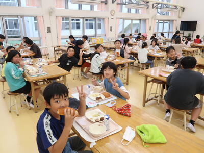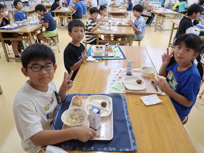 このホームページでもお知らせしていましたとおり、今日から給食が再開し、センターによる給食がスタートしました。初日のメニューは、ハンバーグおろしソースがけ、のり酢和え、トン汁、ご飯、牛乳。おかず類は子どもたちの人気メニューです。夏休み明け、給食を楽しみにしている子どもたちも多かったと思います。うれしい心遣いです。