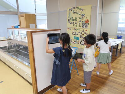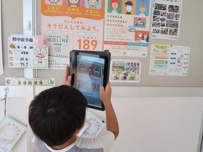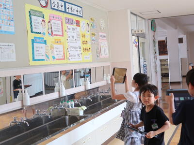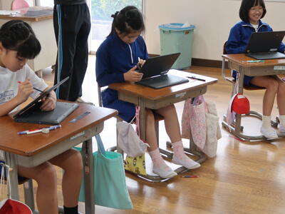 様子を聞くと、国語の授業で「メッセージを見つけているんです」とのこと。この時間は、国語の「みの回りのものを読もう」という単元で、校内の標識や看板、ちらし・ポスターなどの「伝える(伝える働きをする)」ものを見つけて、その内容や工夫を調べる活動でした。タブレット端末で記録し、端末内のメモ用紙に自分の考えを記入していきます。端末を効果的に活用しています。そして子どもたちが使いこなしていることにも感心します。