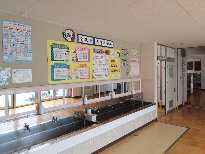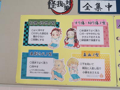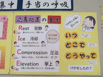 養護教諭がこの夏休み、この掲示物作成にチャレンジしたとのこと。「怪我の対策 全集中 手当の呼吸」タイトルにもひかれます。子どもたちに注意をうながすとともに必要な知識が学べるすてきな掲示資料です。