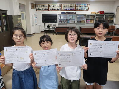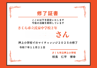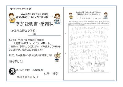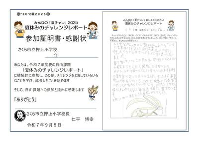 夏休みの自由課題「夏休みのチャレンジレポート」に多くの子どもたちのレポートの提出があったことを以前お知らせしました。先日、提出した児童に校長室に来てもらい、提出したことに対する「参加証明書&感謝状」を渡しました。(渡したものはこのようなものです。右半分は、提出したレポートを載せています。)