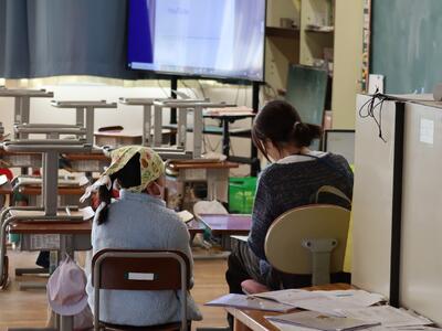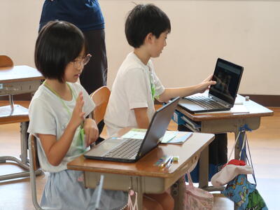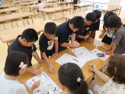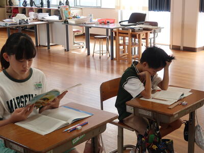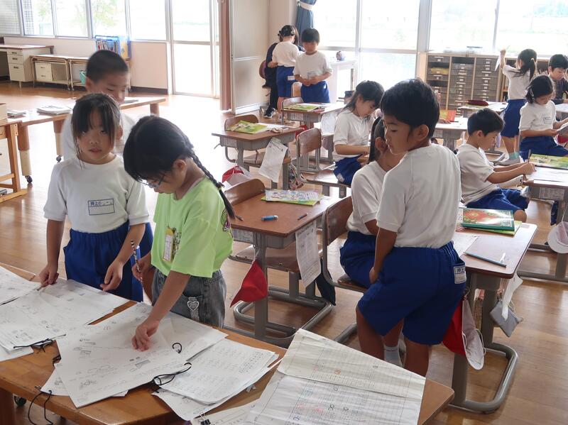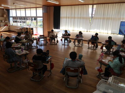 5年生の教室では、子どもたちが輪になって頭を突き合わせて何かを読んでいました。