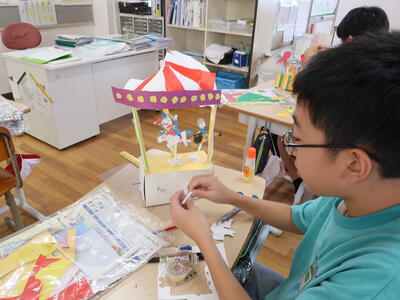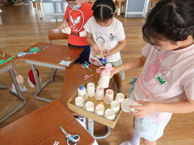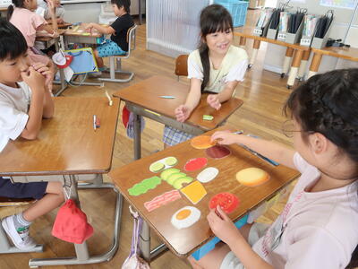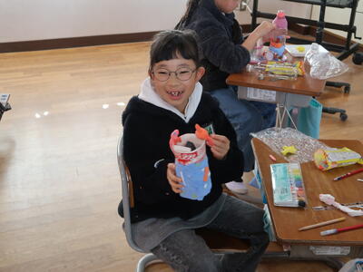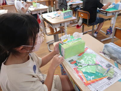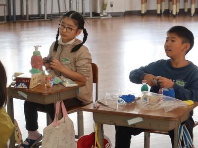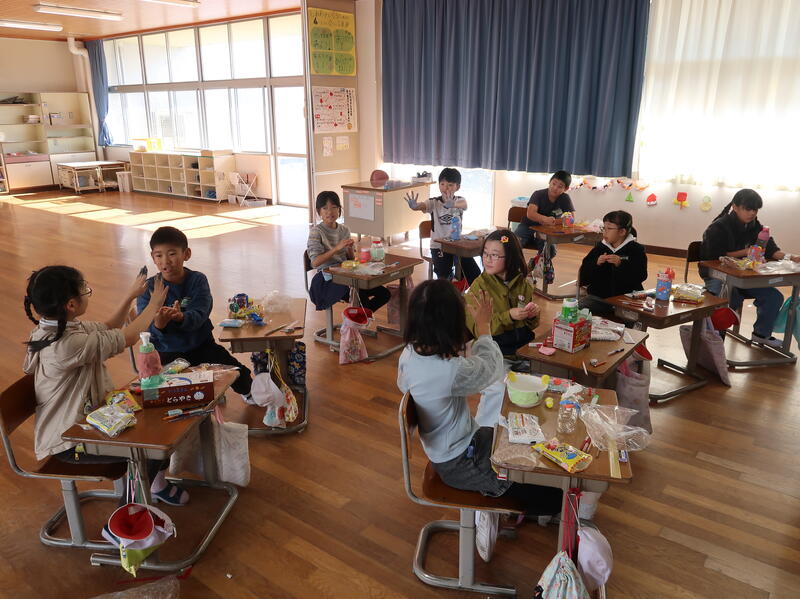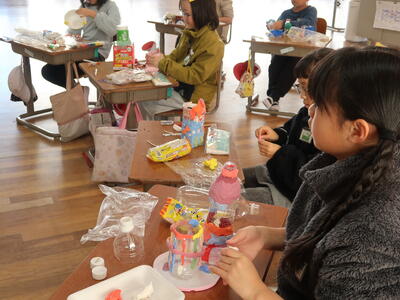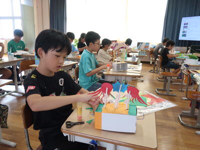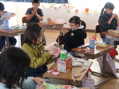 図工「空きようきのへんしん(空き容器の変身)」という学習で、用意した空き容器に紙粘土を貼り付けたりしながら、生活の中で使うもの(小物入れなど)をつくり出す活動です。粘土も絵の具で着色していろいろな形を作って容器を変身させます。「校長先生、赤い粘土と黄色の粘土を混ぜたらオレンジっぽくなりました!」「ここに粘土を貼り付けて…次はどうしようかな」など子どもたちはあれこれ発見したり考えたりしながら楽しそうに活動していました。先生も一緒に小物づくりです。先生の様子も参考に、友だちの作品も見ながらアイデアやイメージをふくらませて創作活動を楽しんでいました。