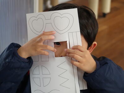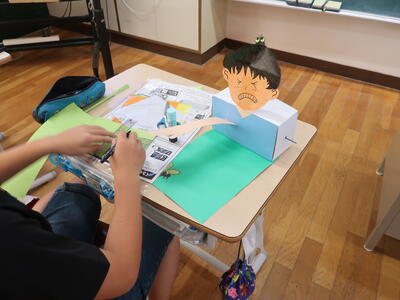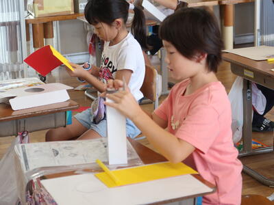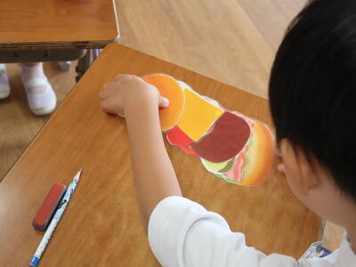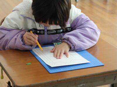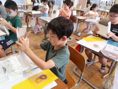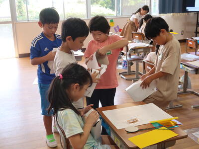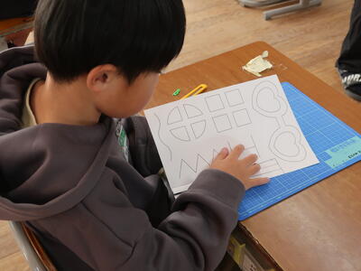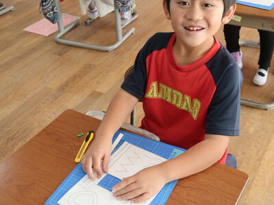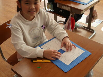 この時間、2年生も図工の授業で、「まどをあけたら(窓を開けたら)」という学習でした。ここでは、カッターナイフを使って画用紙に切り込みを入れて窓を開けていく活動をします。この時間はカッターナイフを使う練習で、子どもたちは真剣に手を動かしていました。直線、ギザギザ、なみなみと、少しずつ難易度アップ。ふだんは元気よく楽しく活動する2年生もこの時間は息を止めドキドキしながらカッターナイフを使い、作業が終わると「ハーァ」っとひと息。添える手の場所やカッターナイフの傾け方など、ポイントがたくさんあり、見ているこちらもちょっとドキドキでした。