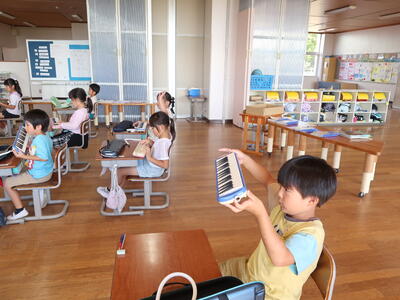 まず対面で開会セレモニー。その後、グループごとに出し物を披露しました。読み聞かせや鍵盤ハーモニカ、ダンス、早口言葉を見てもらいました。ジェスチャーを入れた読み聞かせ、みんなの歌に合わせた鍵盤ハーモニカ演奏、運動会でも披露したダンス、そして全員でがんばった早口言葉。園の子たち、とても楽しそうに見てくれました。