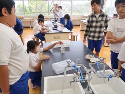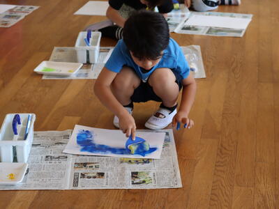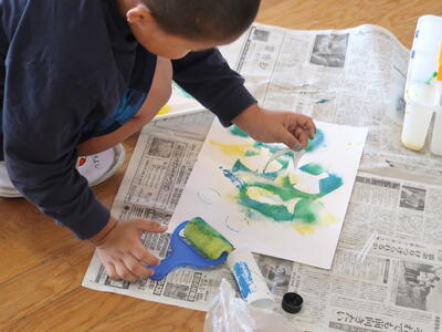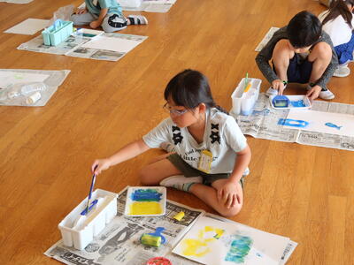 3年教室で子どもたちが手をいろいろな色に染めながら楽しそうに活動していました。