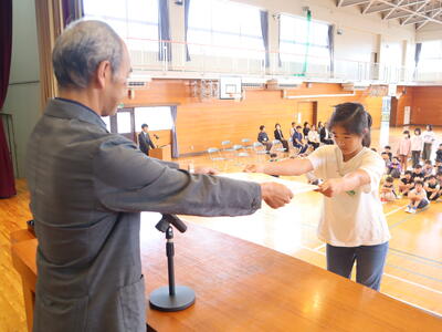 19日(水)朝、表彰朝会で今年度4回目の「松の実賞」の表彰を行いました。