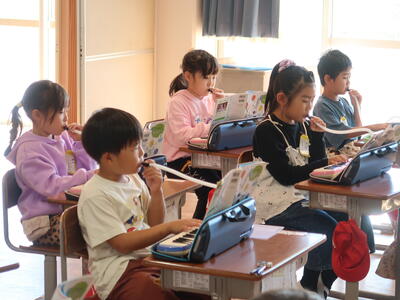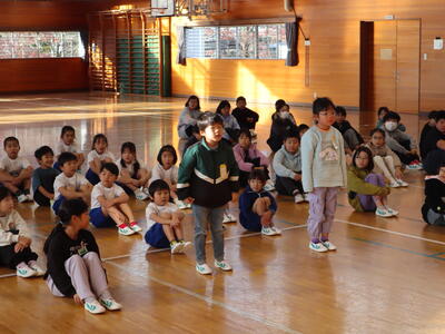 4日、かわいらしい幼稚園・保育園の子たちが本校に来ました。1年生の生活科の学習で「新しい1年生を招待しよう」という活動があり、この日は、園の年長さんを学校に招待して、一緒にいろいろ活動する交流会の日でした。