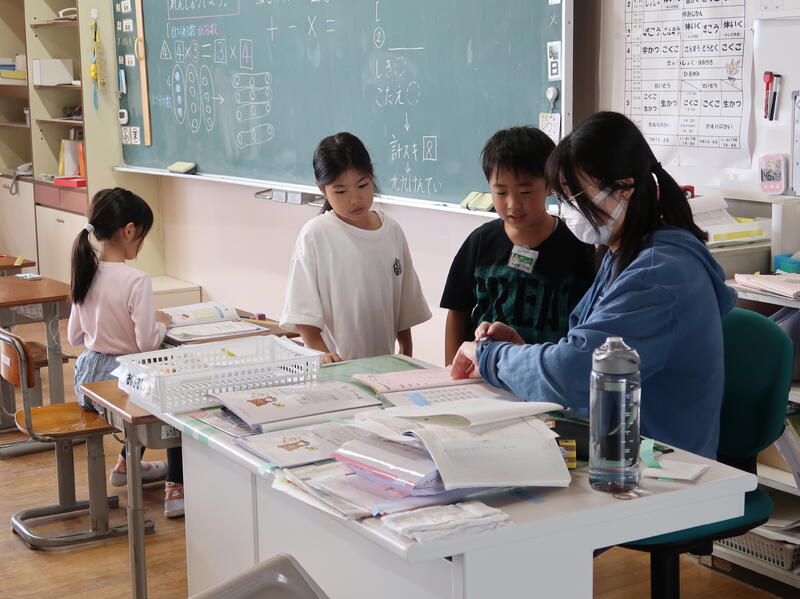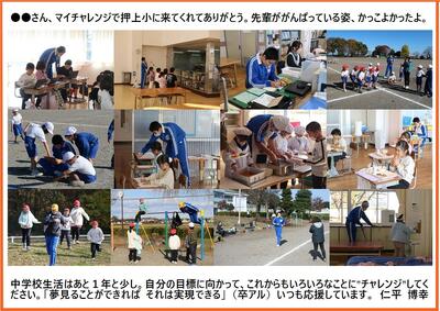 先週、17日から1週間、氏家中学校で「マイチャレンジ」(2年生の職場体験)が実施されました。本校でも生徒1名(本校卒業生)を受け入れ、子どもたちの学習サポートや生活のお手伝いなどをしてもらいました。また、授業では先生方のサポートや声かけなどもお願いし、積極的に取り組んでもらいました。私も、卒業生ががんばっている姿を間近に見られとてもうれしく感じました。