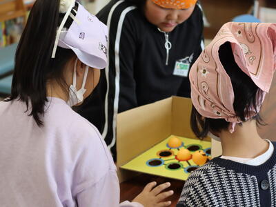 続いて、「おもちゃランド」です。校庭の木の実や松ぼっくりなどで作ったさまざまなおもちゃで遊びます。どんぐりごまやけん玉、迷路、やじろべえなどいろいろ工夫して作られています。1年生は説明したり、遊ぶお手伝いをしたりと大忙し。園の子たちも夢中になって遊びました。
