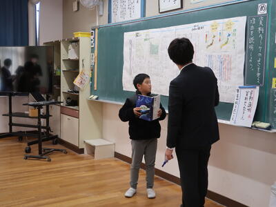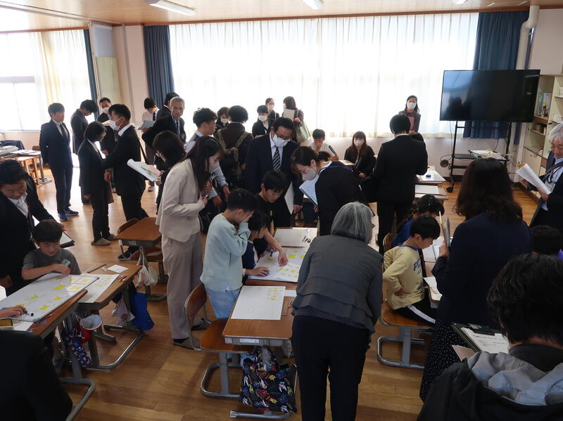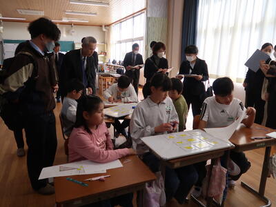 今回は、宇都宮大学教職大学院の先生が指導者として来校され、外国語を担当する先生と一緒に授業を参観、その後、授業研究会が行われました。授業は本校で外国語を担当している先生お二人がこれまでいろいろ準備してきた活動で、子どもたちが参観者の先生方を実際のさくら市内の地図をもとに道案内をする内容でした。子どもたちは、はじめて会う方とのコミュニケーションで緊張したかもしれませんが、一人一人が精一杯相手に伝えようと、反応を見ながらチャレンジしていました。