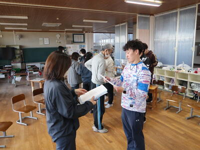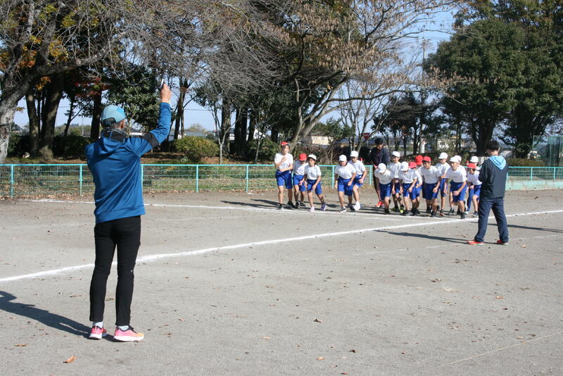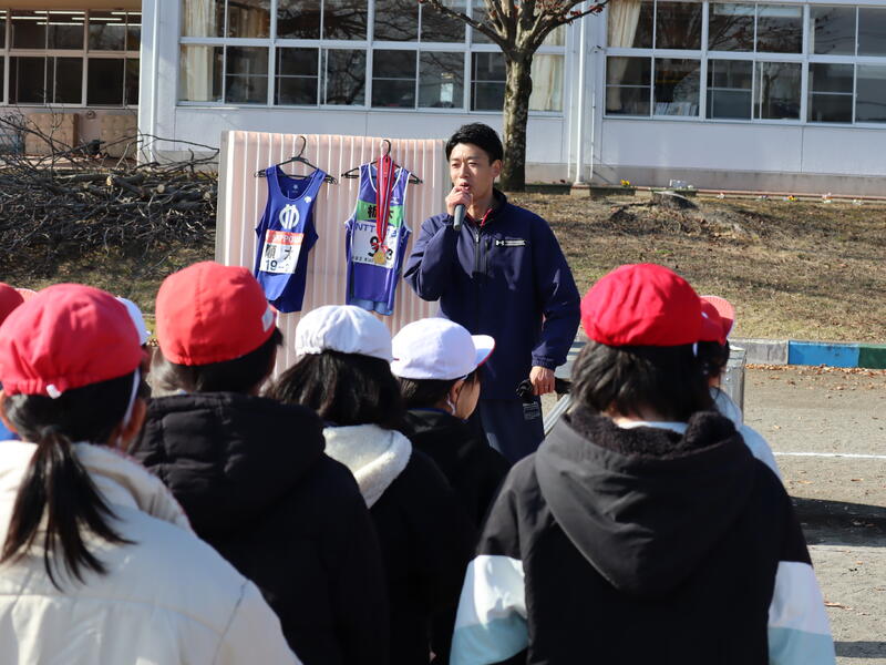 昨年に引き続き、当日は「スペシャルゲスト」として、子どもたちの先輩にあたる、的場亮太(まとばりょうた)さんにお越しいただきました。的場さんは、本校卒業後、氏家中、大田原高、順天堂大学へと進み、大学在籍時には箱根駅伝に出場、また、都道府県対抗駅伝大会で栃木代表として出場し優勝を飾った大先輩です。その後、実業団で走り続け、現在はさくら市の職員としてがんばっています。的場さんが小学生の時に、私も本校に勤めていて、そのつてでオファーした次第です。