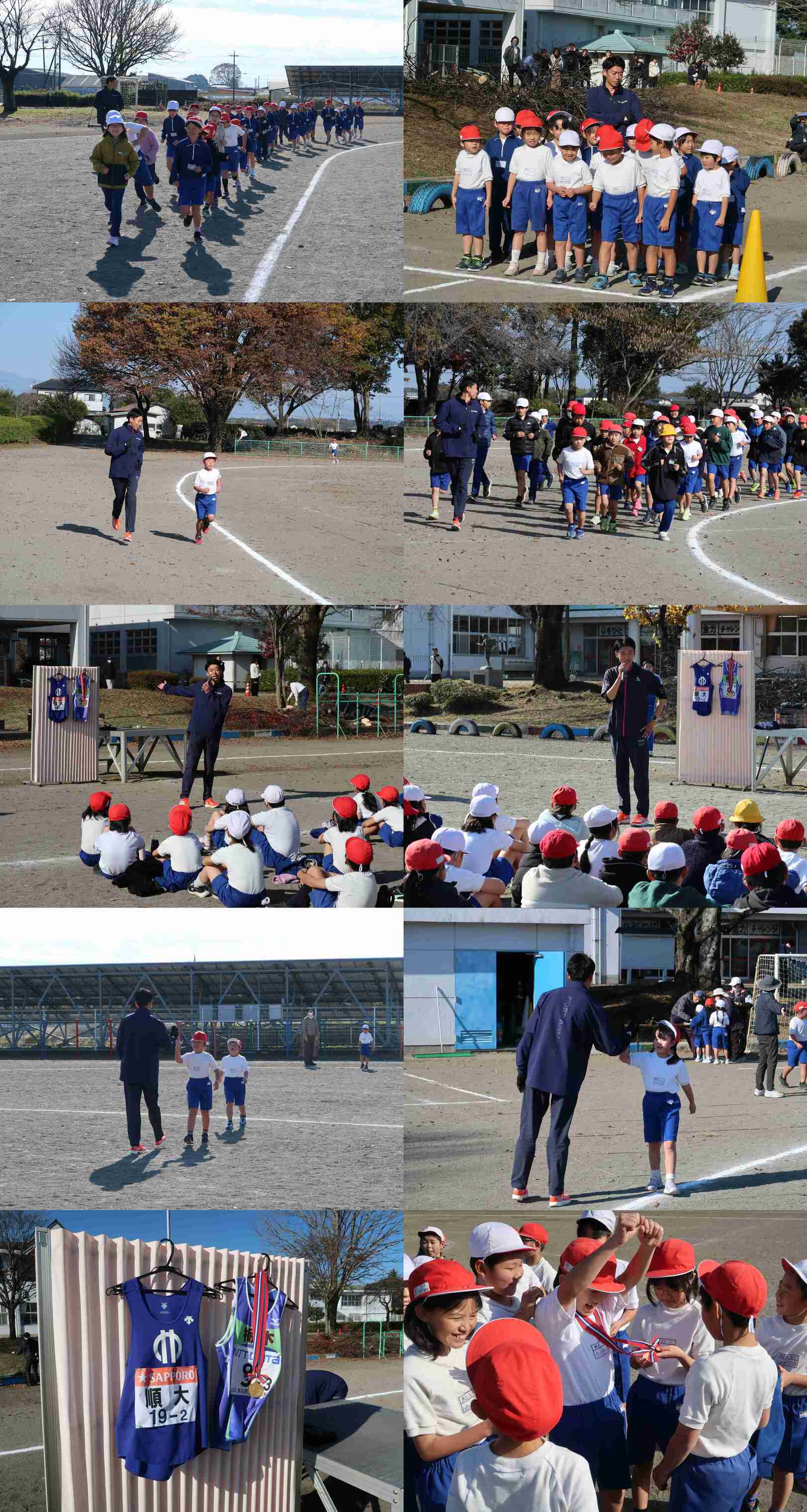 的場さんは、子どもたちと一緒に準備運動やアップ、そして本番では伴走をしていただきました。走り終わった1年生一人一人に「がんばったね」のハイタッチ(うれしいプレゼントですね。2年生以上は昨年してもらったと思います。)。子どもたちは先輩からのプレゼントにとてもうれしそうにしていました。また、的場さんが出場した箱根駅伝のユニフォームと都道府県対抗駅伝大会のユニフォームと金メダル(!!)も持参いただき子どもたちに披露していただきました。子どもたちも大興奮、こちらもすてきな思い出となりました。