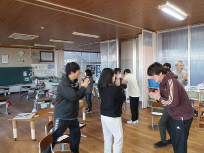 また、ラフターヨガ(笑いヨガ)も行いました。手をあげ息を大きく吸って、吐きながらみんなで「ハハハ」と笑ったり、いろいろな相手と手を合わせながら笑い合ったりと、楽しい気分になる一時でした。