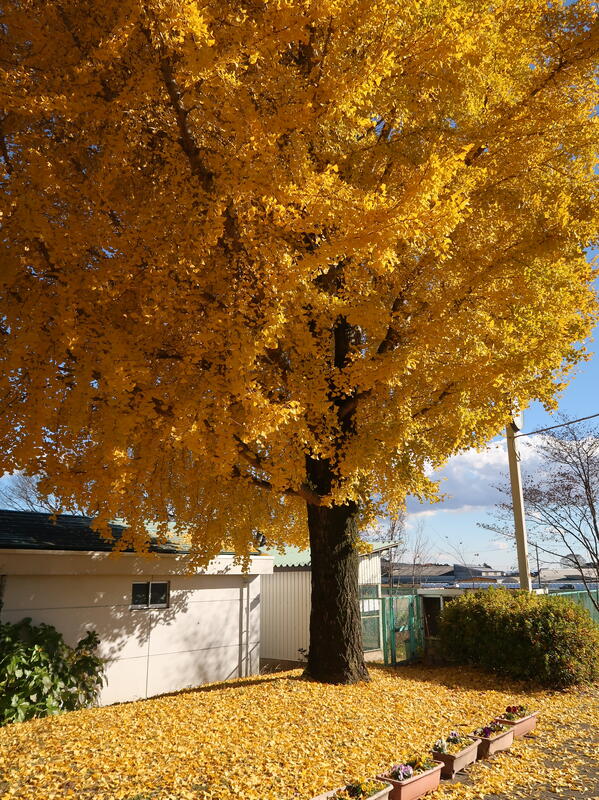 先日の昼休み、校舎南の大きなイチョウの木が日差しに映えて黄色い葉がキラキラと輝いて黄金のように見えました。